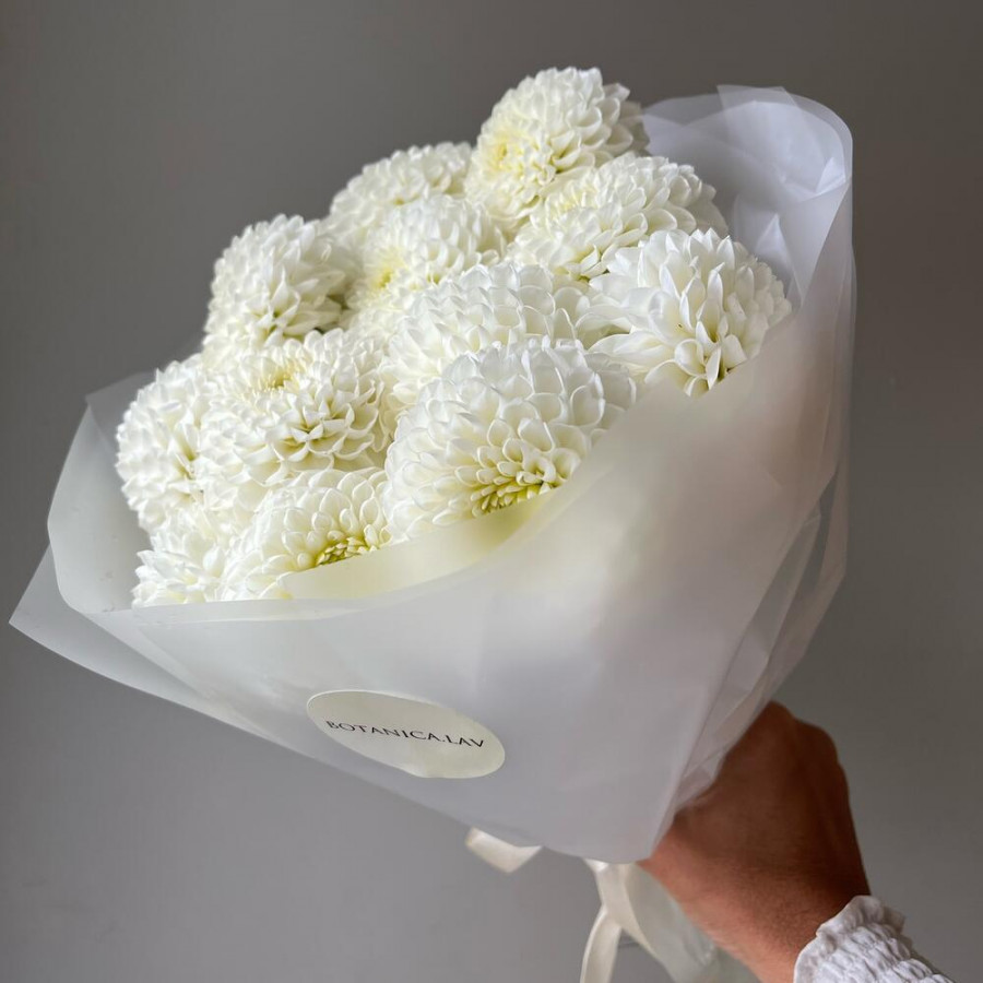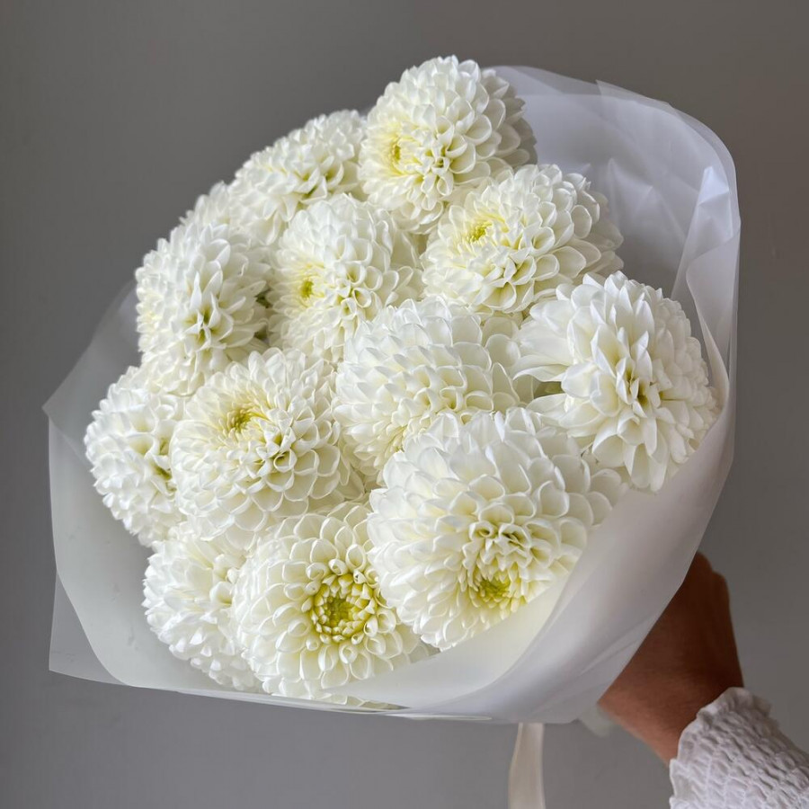 На фото букет из 13 белых георгин. В составе: георгина 13 шт, дизайнерская упаковка 1 шт, атласная лента 1 шт, . Все цветы свежие и ароматные, букет красиво оформлен и отлично подходит для подарка. Доступна доставка цветов или самовывоз.