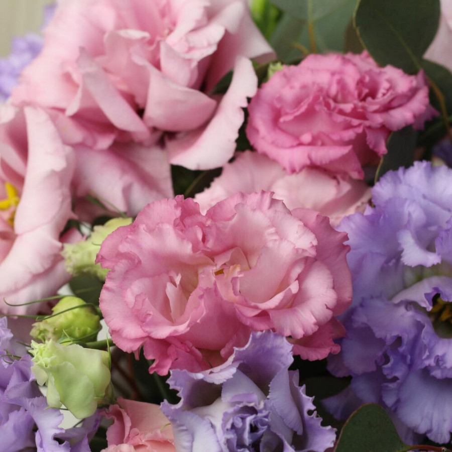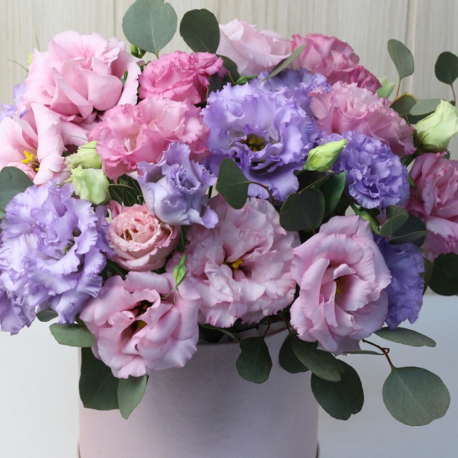 Букет из 15 розовых и сиреневых эустом в коробке в Амурске