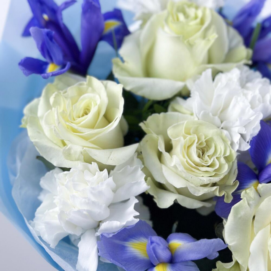 Букет из белых гвоздик, синих ирисов и белых роз фото 3