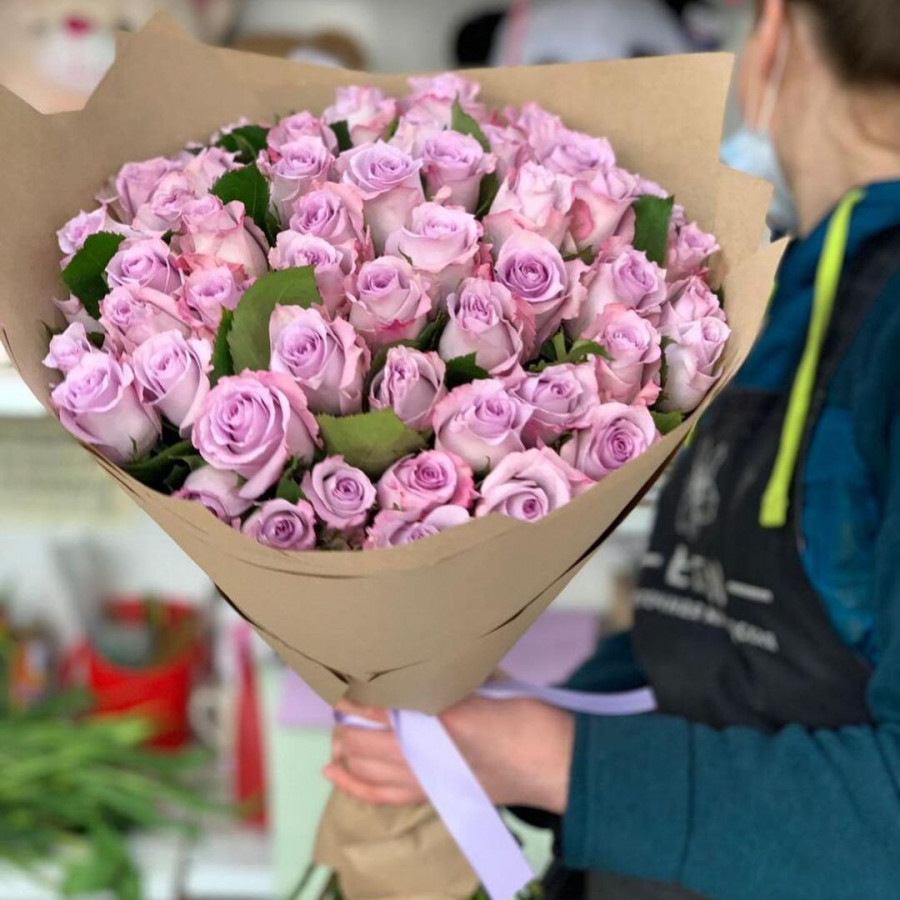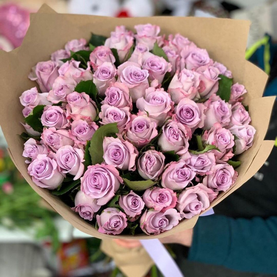 На фото букет из 45 сиреневых роз. В составе: роза 45 шт, крафт-бумага 1 шт, атласная лента 1 шт, . Все цветы свежие и ароматные, букет красиво оформлен и отлично подходит для подарка. Доступна доставка цветов или самовывоз.