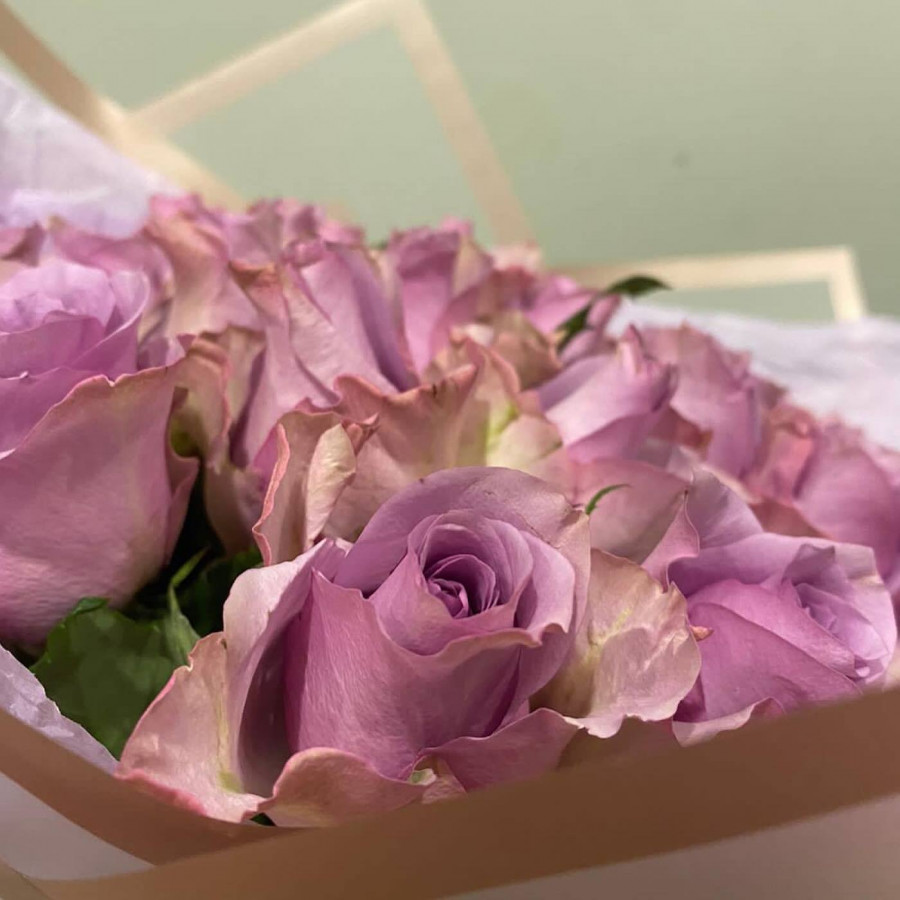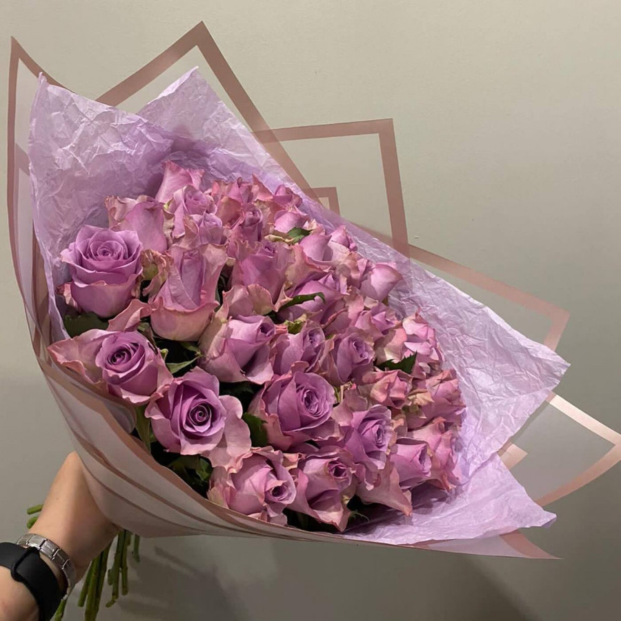 На фото букет из фиолетовых кенийских роз. В составе: роза (кения) 33 шт, крафт-бумага 1 шт, атласная лента 1 шт, . Все цветы свежие и ароматные, букет красиво оформлен и отлично подходит для подарка. Доступна доставка цветов или самовывоз.