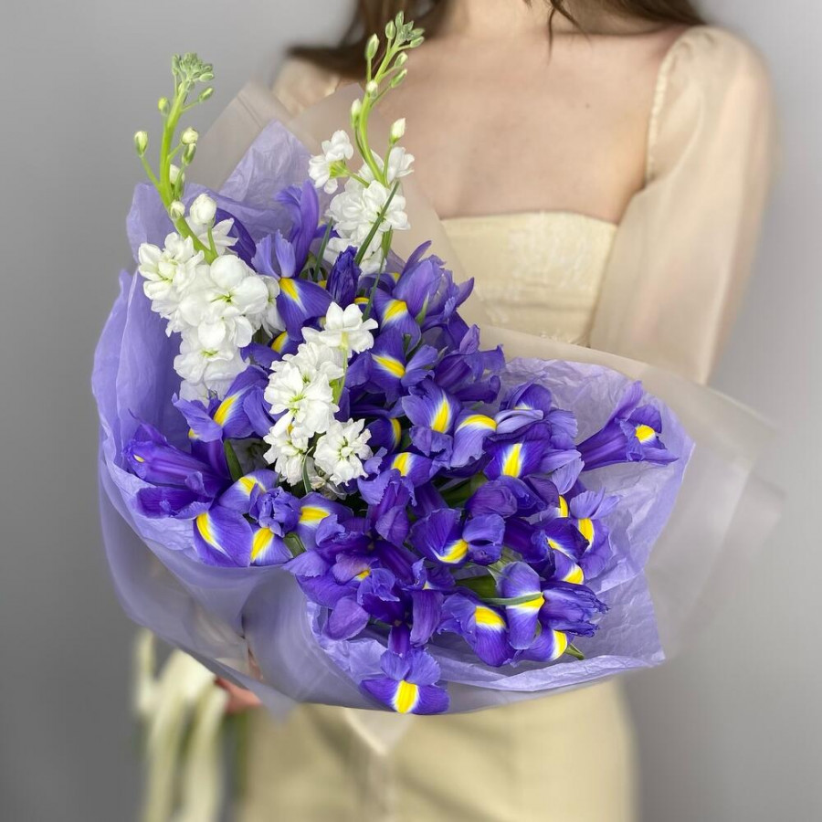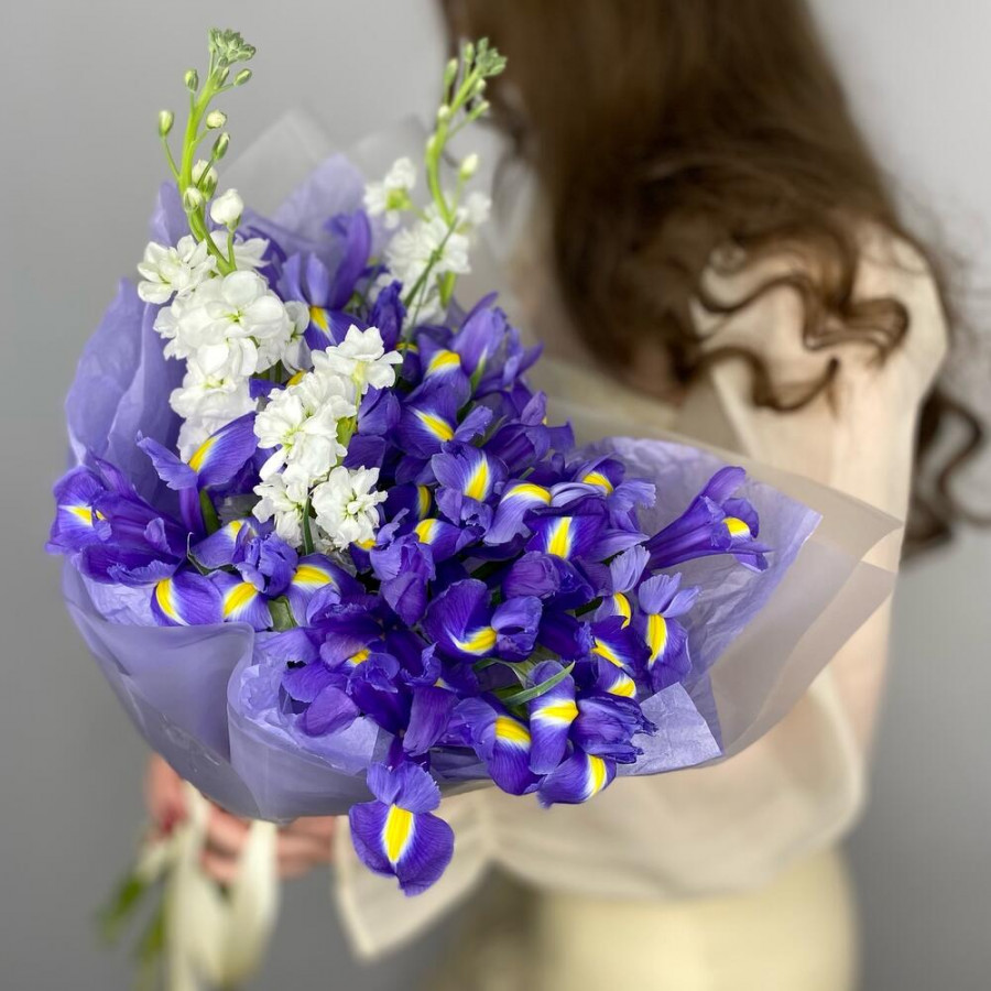 На фото букет из синих ирисов и белой маттиолы. В составе: ирис 15 шт, маттиола 3 шт, дизайнерская упаковка 2 шт, атласная лента 1 шт, . Все цветы свежие и ароматные, букет красиво оформлен и отлично подходит для подарка. Доступна доставка цветов или самовывоз.