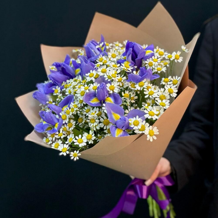 На фото букет из синих ирисов и танацетума. В составе: ирис 9 шт, танацетум 6 шт, крафт-бумага 1 шт, атласная лента 1 шт, . Все цветы свежие и ароматные, букет красиво оформлен и отлично подходит для подарка. Доступна доставка цветов или самовывоз.