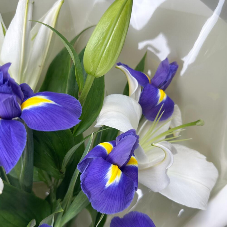 На фото букет «магия лилий». В составе: лилия 1 шт, ирис 5 шт, дизайнерская упаковка 1 шт, атласная лента 1 шт, . Все цветы свежие и ароматные, букет красиво оформлен и отлично подходит для подарка. Доступна доставка цветов или самовывоз.