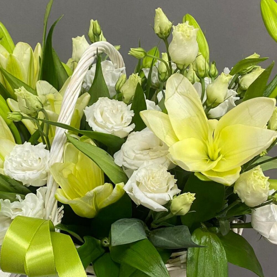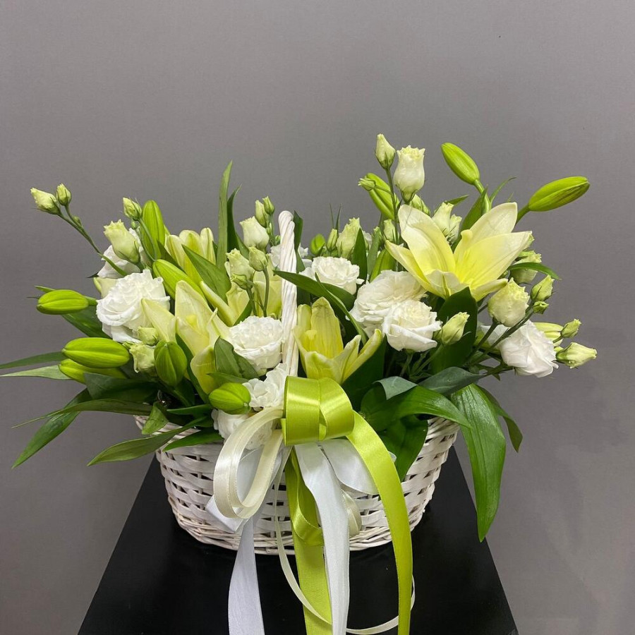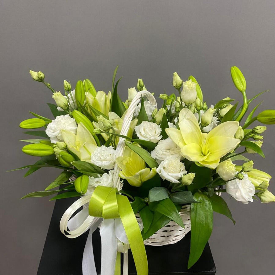 Корзина с белыми лилиями и эустомами